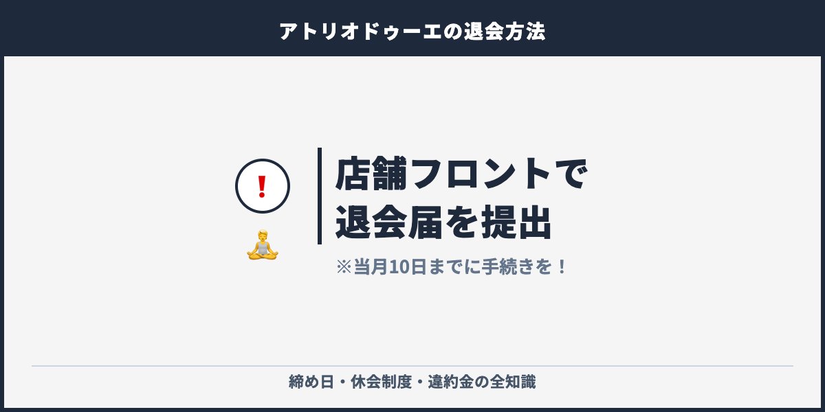 電話・FAX・郵送・メールでの退会手続きは一切受け付けていません。また、代理人による手続きも不可です。必ず本人が直接店舗フロントで手続きしてください。