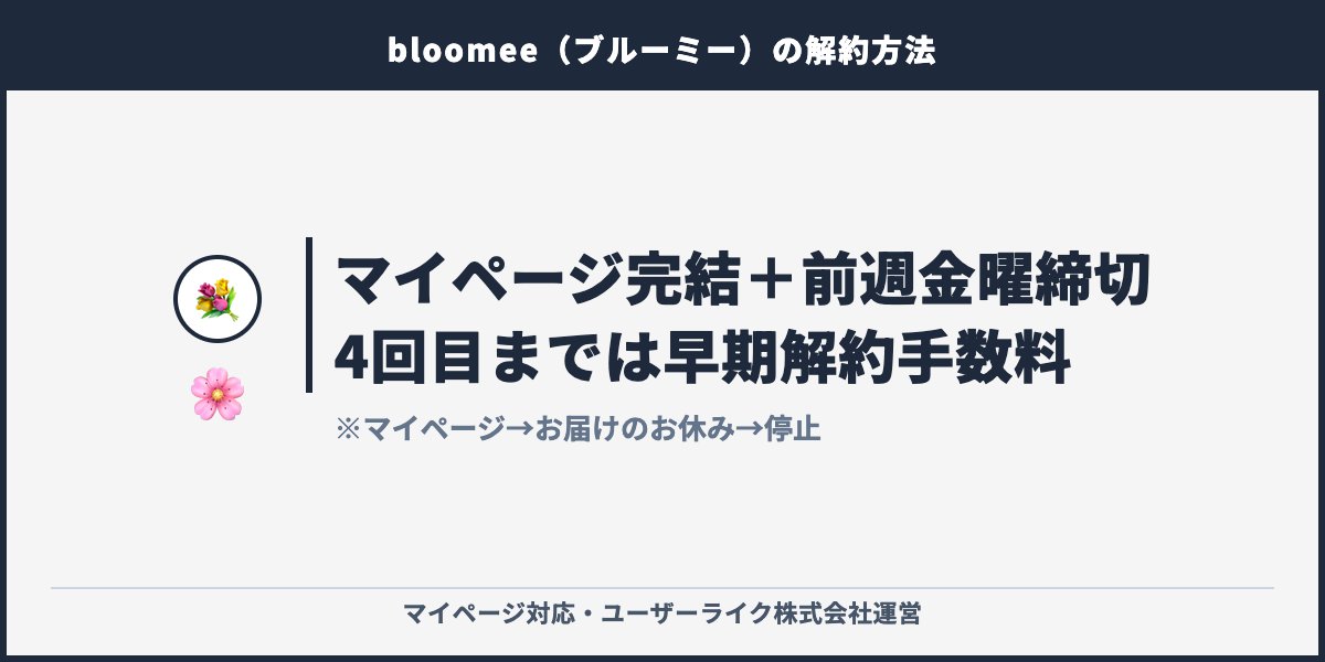 bloomeeの解約締切は、停止希望週の前週金曜23:59までです。