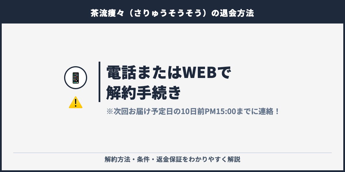「茶流痩々(さりゅうそうそう)を退会したいけど、手続き方法がわからない…」 電話またはフォーム(0120-28-2517)で手続きできます。次回お届け予定日の10日前PM15:00までに連絡してくださ ...